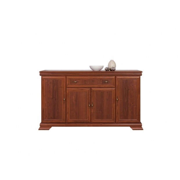 Komoda, čtyřdveřová s jednou zásuvkou, vhodná na zařízení obývacích pokojů, ložnic i pracoven, materiál: DTD laminovaná, dvířka MDF + ozdobné lišty. Barevné provedení: ořech ecco, univerzální dvířka (L / P), kovové úchyty. Rozměry (ŠxVxH): 168x97x45 cm. Dodávána v demontu.