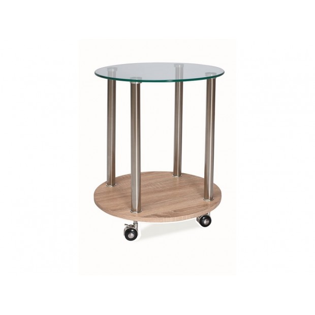 Moderní konferenční stolek netradičního vzhledu. Kulatá spodní polička je vyrobena z kvalitní MDF v barvě dub sonoma, nohy jsou z kovu-chróm a odkládací deska z tvrzeného průhledného skla. Stolek má kolečka pro snadnou manipulaci. Šířka: 50 Výška: 55 Délka: 50 Váha: 8.0000 Barva: Dub sonoma Výchozí barva: dub sonoma, chróm Materiál: MDF, kov, sklo