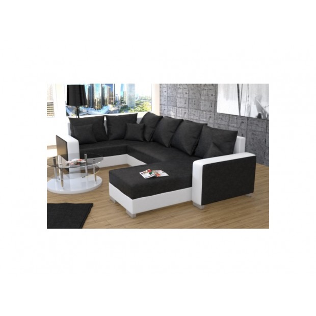 Rozkládací univerzální rohová sedací souprava s úložným prostorem, ekokůže bílá / látka černá, Boredo